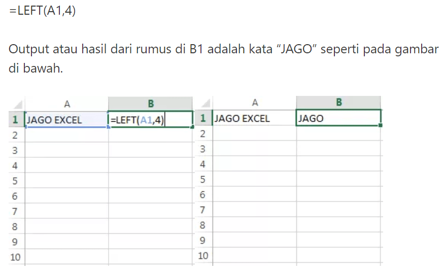 Ketiga fungsi ini dasarnya hampir sama namun ada beberapa perbedaannya terutama dalam pemakaiannya. LEFT berfungsi untuk mengambil beberapa karakter teks dari arah kiri atau awal sebuah kalimat. RIGHT berfungsi mengambil beberapa karakter teks dari arah kanan atau akhir sebuah kalimat. Sedangkan MID berfungsi untuk mengambil beberapa karakter teks dari posisi tengah. Contohnya :